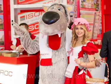 Девушки и юноша от нашего агентства работали в качестве аниматоров. Парень перемещался по территории выставки в ростовой кукле волка, а девушка работала в промо форме красной шапочки. Вместе они создавали привлекательный тандем, дарили посетителям промо продукцию и приглашали посетить стенд.